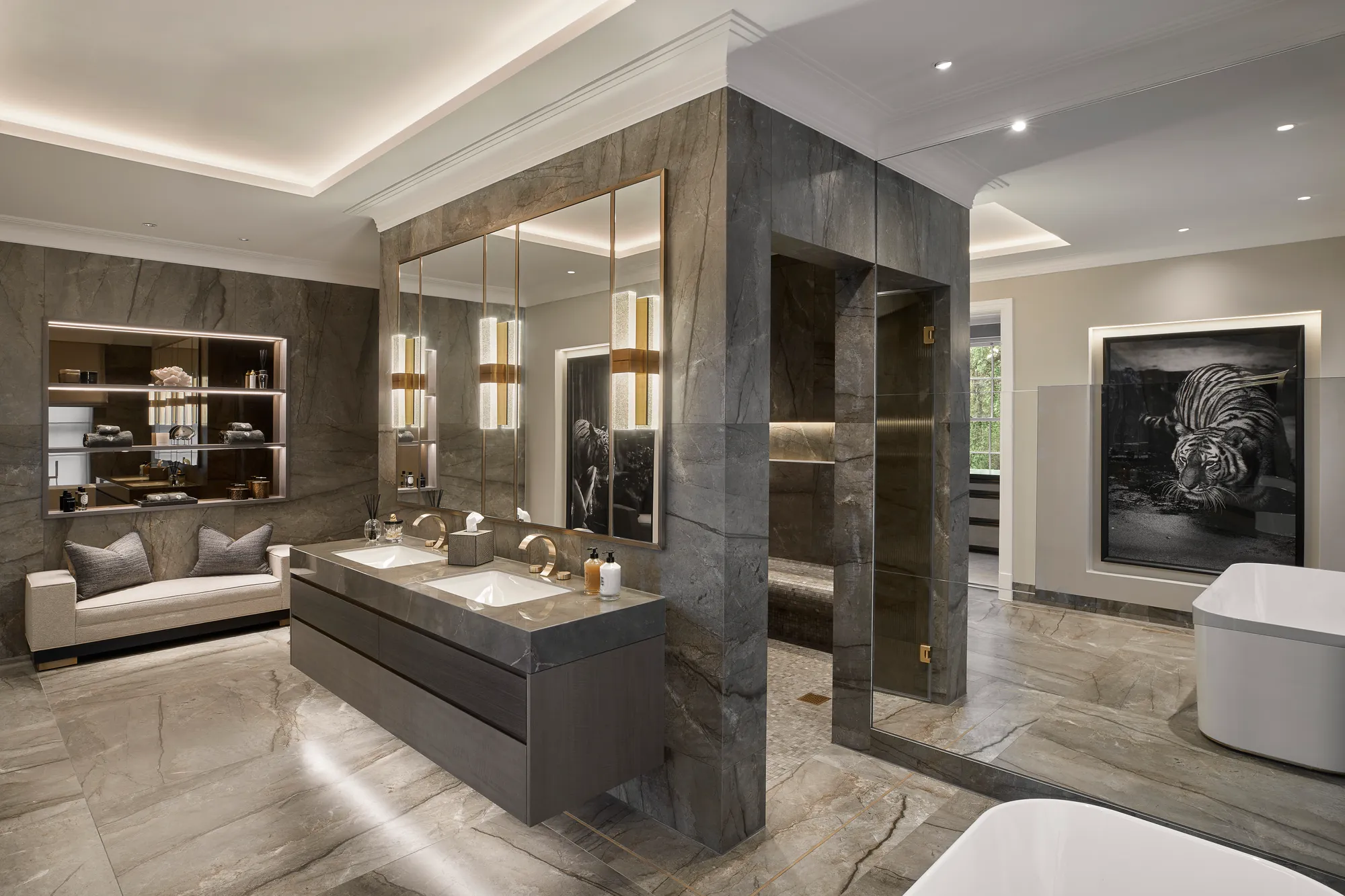 Well placed lighting can enhance textures, niches, and design details. Inspire concept uses subtle illumination to draw attention to statement tiles, freestanding baths, or bespoke cabinetry. This thoughtful use of light adds depth and dimension, making the entire Luxury Bathrooms Design feel more dynamic and visually engaging.